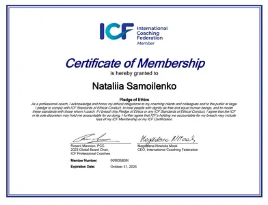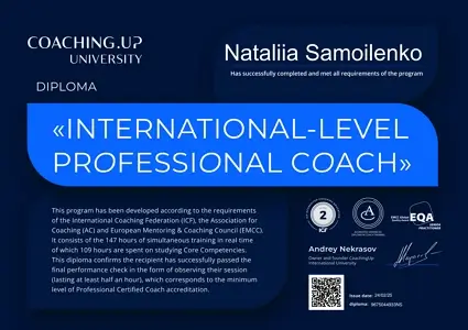Та моя експертиза вже давно вийшла за межі цифр і звітів. У 2024 році я стала сертифікованою коучкою (ACC ICF), щоб допомагати іншим перетворювати виклики на можливості. У своїй практиці я поєдную структурність і глибину: спираюся на управлінський досвід, але працюю з людьми, а не з таблицями.